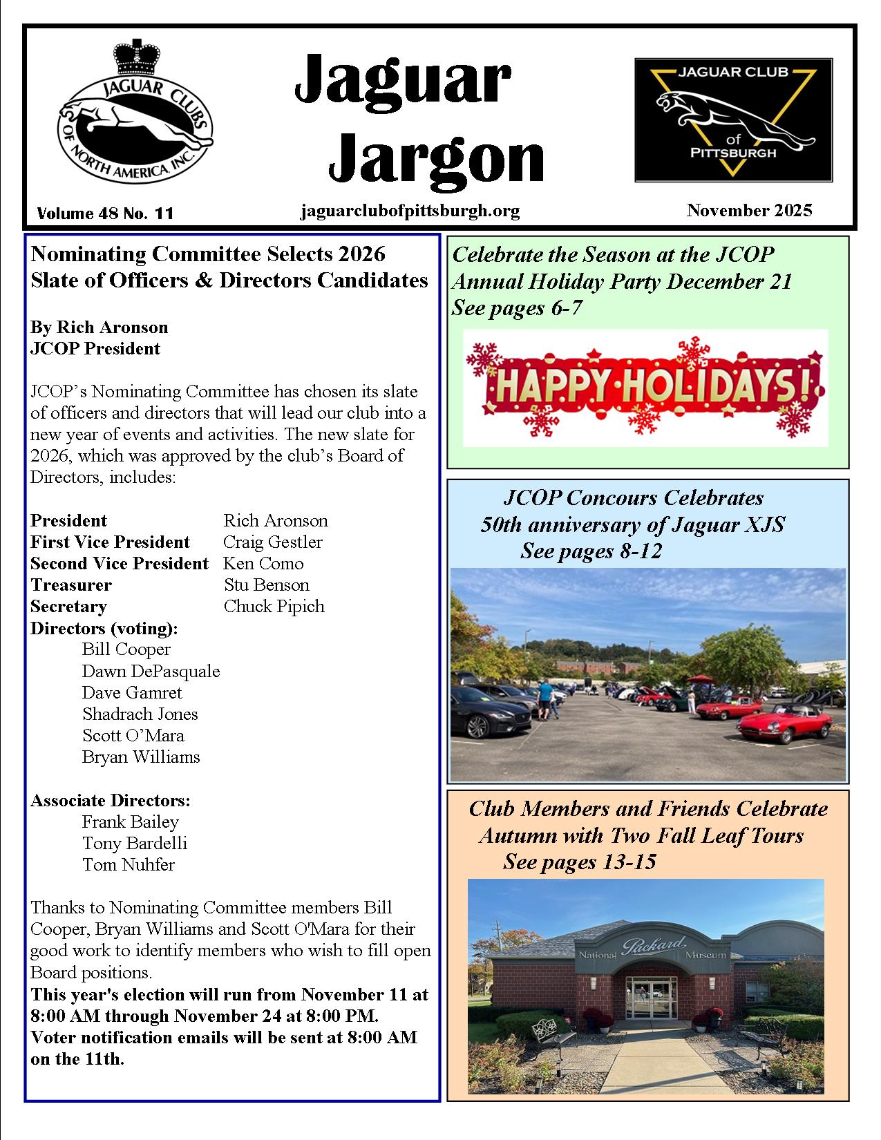 Jaguar Club Of Pittsburgh NC Region - Club #45 Formed: 1971 Members: 100 plus Jaguar Club of Pittsburgh is a friendly group that provides a schedule of events that all Jaguar enthusiasts can enjoy. Hardly a month goes by that there isn't some reason to get together, from tech sessions to dinners to drives to nice locations to car shows to Concours d'Elegance to weekend trips to interesting events and activities. We'd love to have you join us! Check out past Jaguar Jargon newsletters on our website to see the range of wonderful events we enjoy.